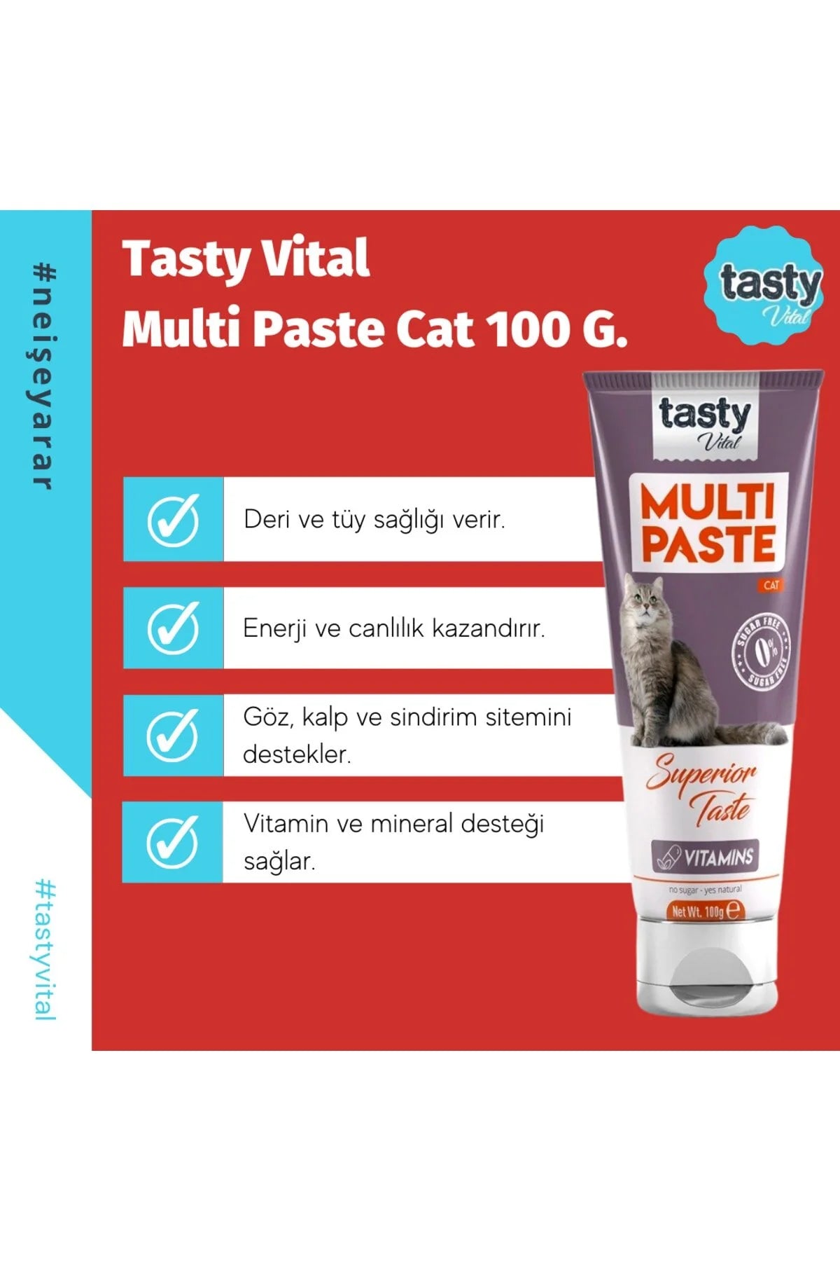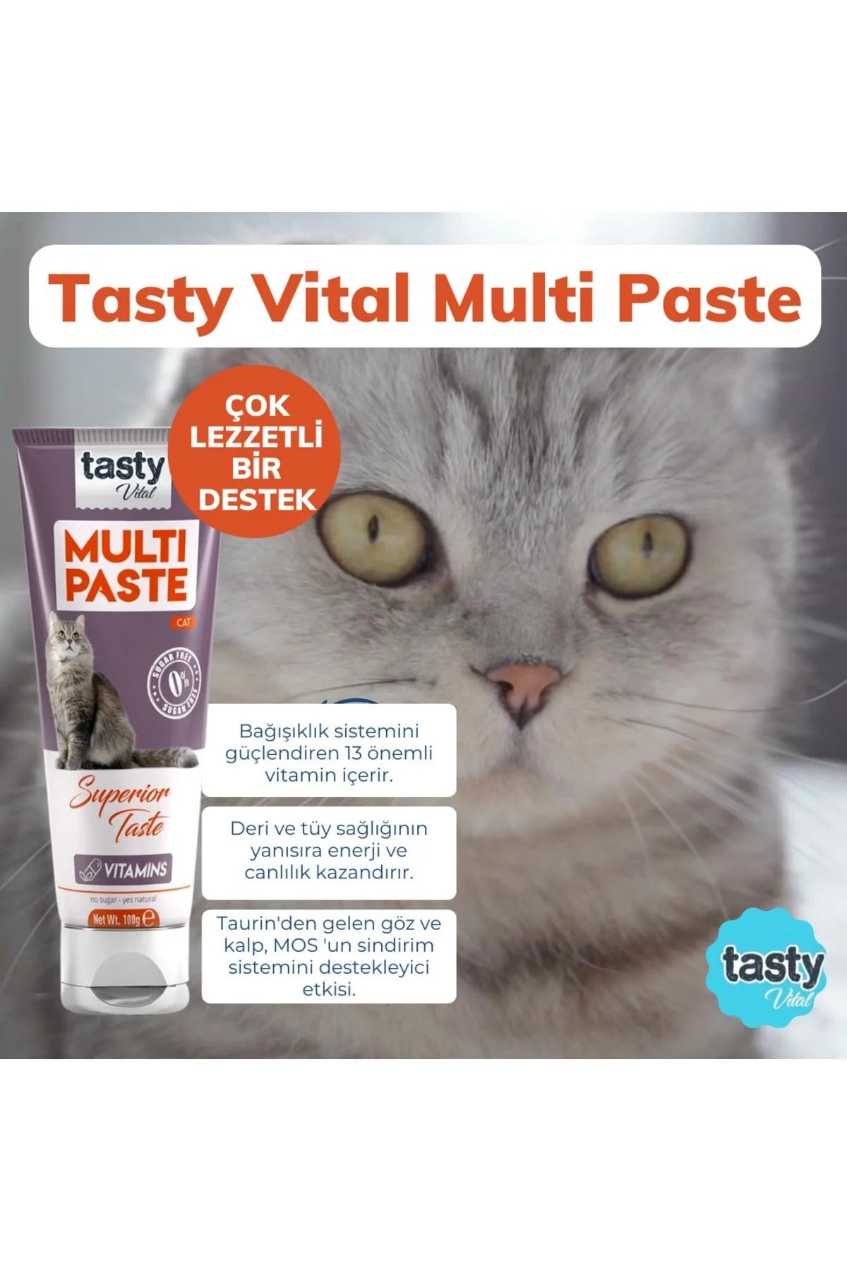 Veteriner önerisiyle geliştirilen Tasty Vital Multivitamin Malt Paste, kedinizin günlük vitamin ihtiyacını destekleyen 13 farklı temel vitamin, MOS (Mannan Oligosakkarit), taurin ve doğal maya türevleri içerir. Lezzetli formu sayesinde seçici kedilerin bile keyifle tükettiği bu özel karışım; bağışıklık, tüy sağlığı, sindirim ve enerji seviyelerini desteklemek için ideal bir tamamlayıcı besindir.