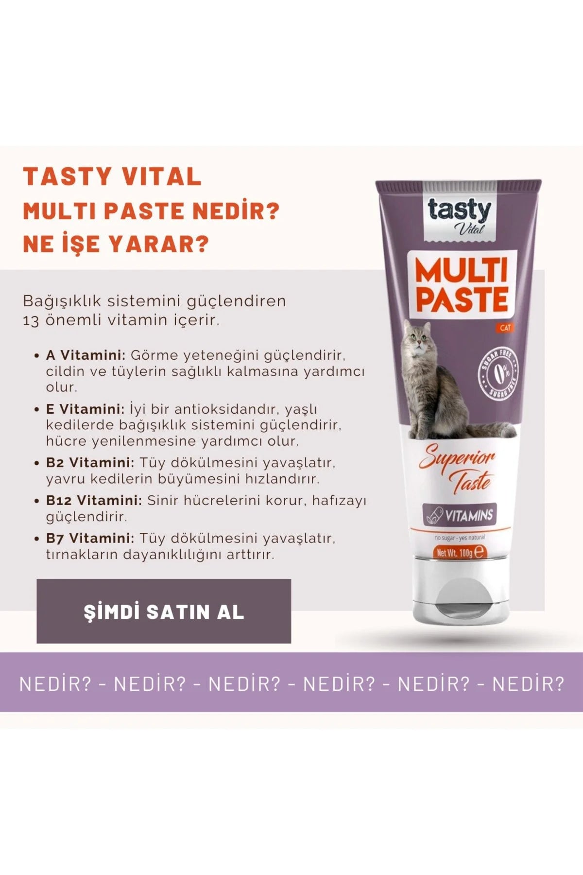 Kediler için özel formüle edilen bu multivitamin pasta, düzenli kullanımda daha parlak, dökülmesi azalmış bir tüy yapısı, daha güçlü bağışıklık ve daha enerjik bir günlük yaşam sunar.