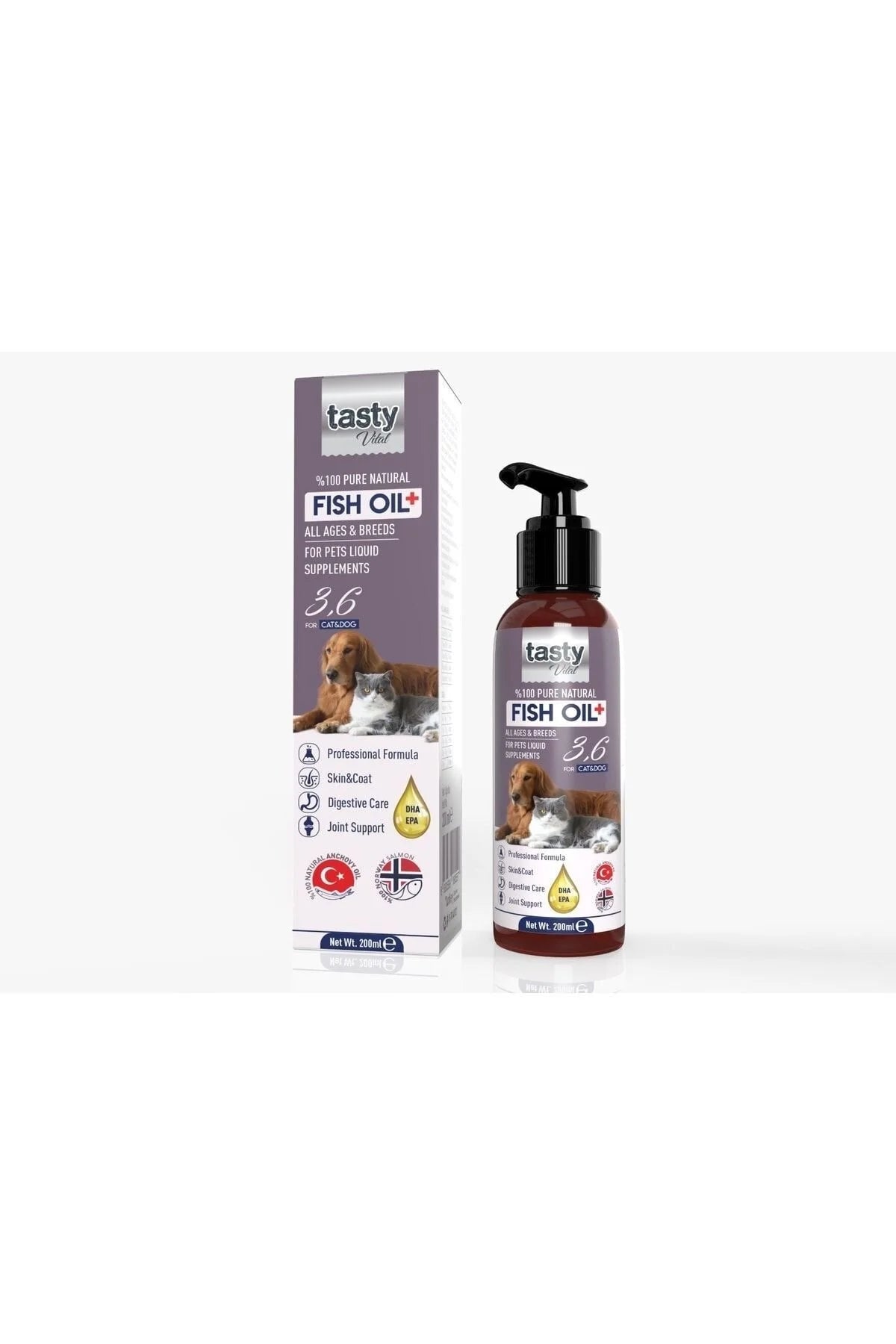 TastyVital Fish Oil+, kediler ve köpekler için özel olarak formüle edilmiş %100 doğal somon ve hamsi yağı karışımıdır. EPA & DHA yönünden zengin bu karışım, tüy dökülmesi, parlaklık kaybı, göz sulanması, iştahsızlık, eklem sertliği ve deri hassasiyeti gibi birçok soruna doğal destek sunar.