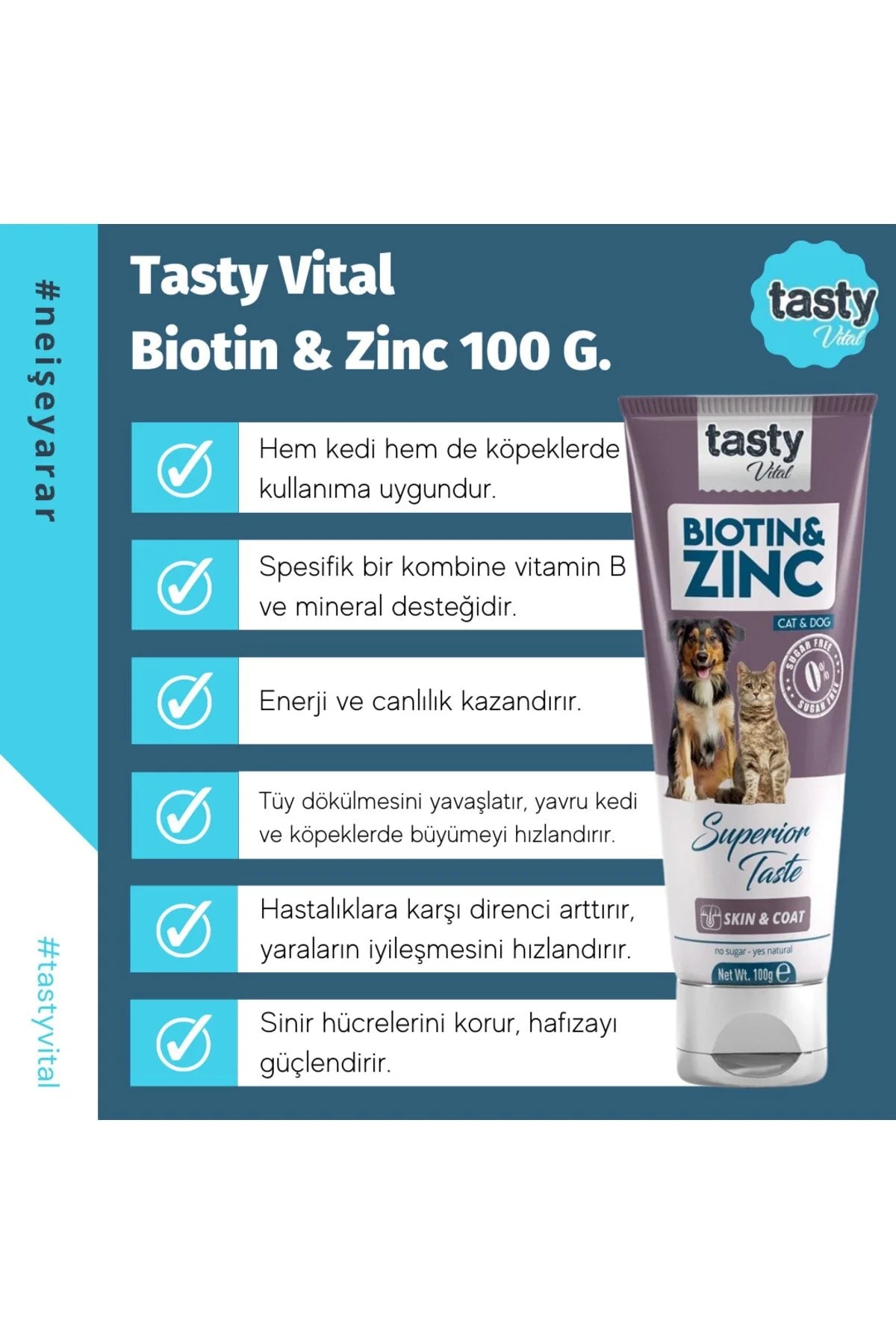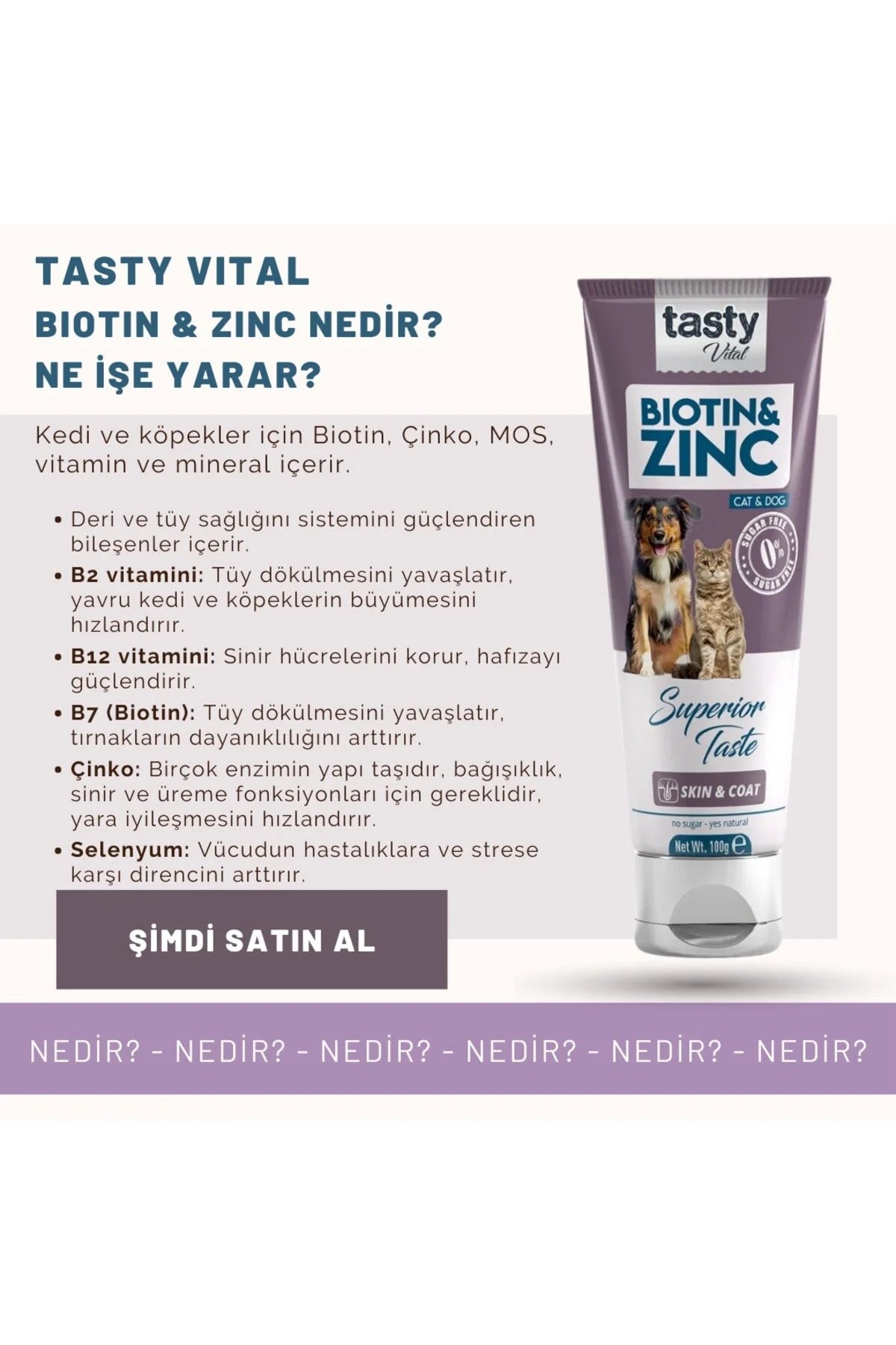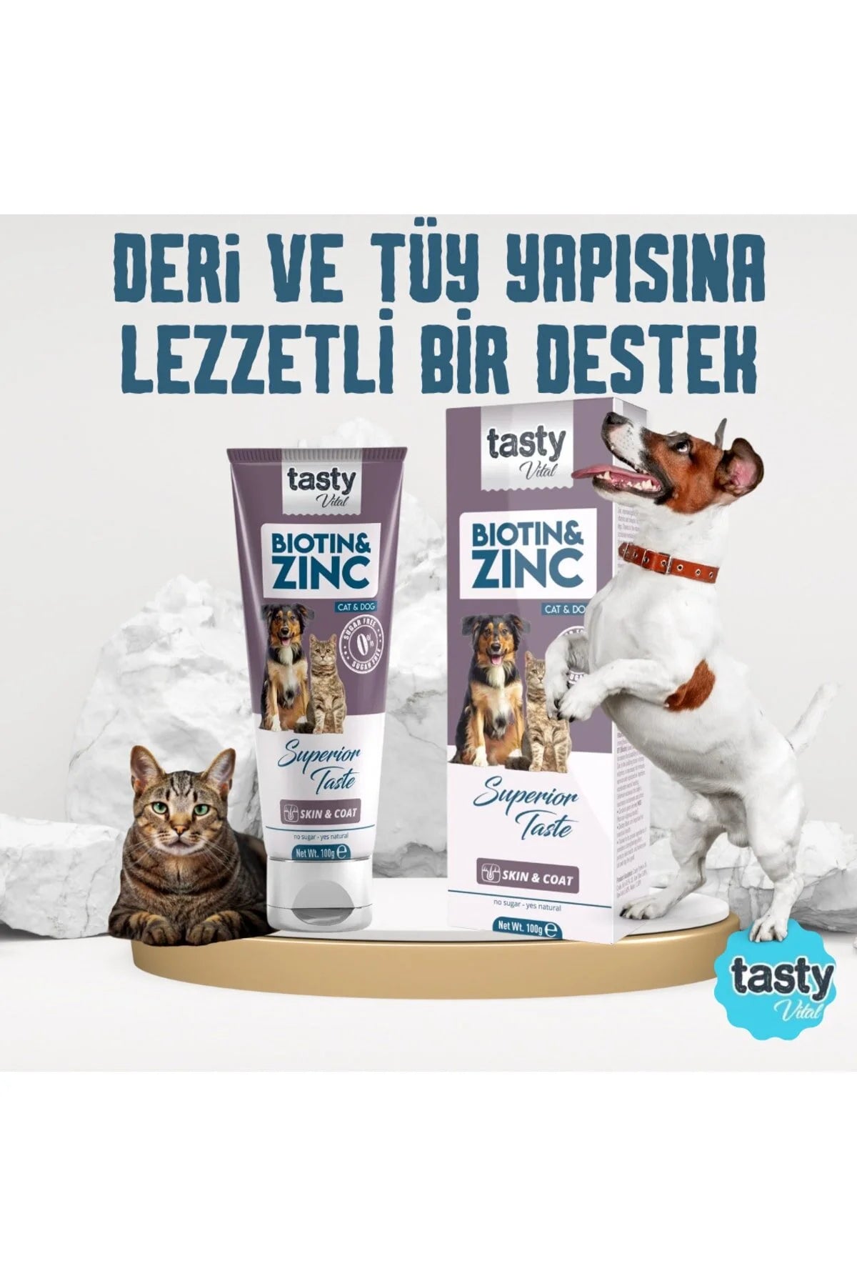 TastyVital Biotin & Zinc Paste, kediler ve köpekler için özel olarak geliştirilen biotin, çinko, B vitaminleri ve minerallerle zenginleştirilmiş bir deri & tüy sağlığı destek macunudur.
